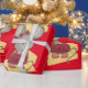 Una familia de ratones muy educada y muy cursi sentada en un patrón de queso, mamá, papá, hijo e hija cada uno en su rebanada de queso, festivo y juguetón Ilustracion de fondo rojo de Suki's, todos los derechos reservados.