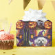 Admire el espíritu de Halloween con este diseño encantador que presenta un perro lindo en un gorra de brujas rodeado de calabazas talladas. Perfecto para añadir un toque de encanto espeluznante a sus celebraciones festivas.