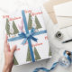Te encantará este patrón de papel de regalo divertido, moderno y caprichoso de Gnome de Navidad. Escena invernal con un gnomo escandinavo de piernas delgadas sosteniendo un pájaro azul frente a pinos. La cita "Feliz Navidad" está en tipografía roja bonita.