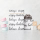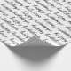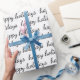 Este documento de envoltura presenta un patrón de 'Felices Fiestas' en fondo negro sobre blanco.