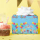 Divertido papel de envolver de cumpleaños con tema azul, niños celebrando con globos, gorras fiestas, confetti, y lugar para el nombre del niño! Ver otro tema coincidente en mi colección!