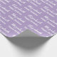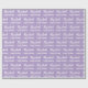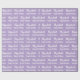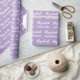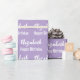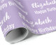 El envoltorio de cumpleaños es morado pálido. Tiene un patrón de texto para el nombre del destinatario en un guión y la frase Feliz Cumpleaños. El nombre (Mostrado: Elizabeth) aparece en un guión elegante. El texto es blanco. Todo el texto se puede editar.