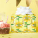 Este impresionante papel de envoltura presenta una imagen gráfica de un lindo abejorro amarillo con rayas negras, ojos, antenas y piernas. Tiene alas azul y blanco bonito. La abeja está sentada en medio de un girasol amarillo dorado. La flor tiene un tallo verde y tres hojas. El mensaje "feliz día de la abeja" aparece esparcido en las tres hojas. El fondo está compuesto por un patrón de abeja amarilla.