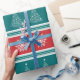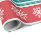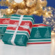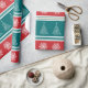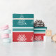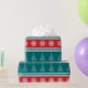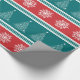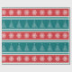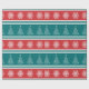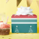 Feliz ilustracion navideño con árbol de Navidad y decoración de copos de nieve sobre fondo rayado rojo, blanco, azul y turquesa