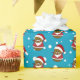 Repetir patrón de una feliz patata de Navidad con sombrero y traje de Santa y con bigote y barba blancos. Fondo azul con muchos copos de nieve blancos.