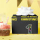 Este divertido diseño de papel envolvente con temática de cumpleaños presenta un gran número "1", lleno de un patrón de estrellas decorativas de varios tamaños y colores. También incluye el mensaje "Feliz primer cumpleaños", y un nombre personalizado. El fondo es negro de color. Papel de envoltura con temas de cumpleaños como este podría ser una manera divertida de envolver un regalo o regalar un regalo para celebrar el primer cumpleaños de alguien. [~Z0000429]