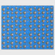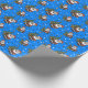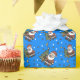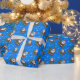 Cute blue festive wrapping paper with a pattern of fun cartoon Santas and Christmas trees. Santa is dressed in his red and white outfit and he is holding a lit lantern, Next to him is a green fir tree decorated with baubles and a yellow star. Ideal to wrap those holiday gifts.