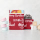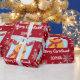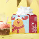 Festive, modern personalized Christmas gift wrap for kids, with Rudolph the Reindeer, the greeting "Merry Christmas" in stylish typography, and a personalized name. On a Xmas red background, with lots of cute snowflakes.
