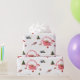 El diseño del papel de envolvimiento navideño festivo de Merry incluye un fondo blanco con pequeños puntos rojos de polka a la imagen del trineo de Santa lleno de regalos. Las palabras "¡Feliz Navidad!" se muestran con letras rojas como un arco sobre el trineo. A lo largo del diseño hay divertidas imágenes de juguetes, regalos y árboles de Navidad. Encantador.