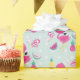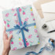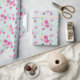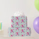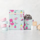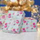 Papel envuelto con un patrón - un lindo ilustracion de un flamingo rosado con algunas sandías y piñas. Color rosa y verde. Summery y tropical. El fondo es de color verde pálido con puntos de polka blanco.