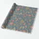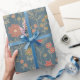Este envoltorio de regalo cuenta con flores estilizadas en tonos de coral y verde oliva sobre un fondo azul denim.