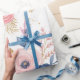 Añade elegancia a tus regalos con este hermoso papel de regalo floral que presenta rosas de color rosa y azul marino en acuarela, combinadas con acentos botánicos dorados. Sobre un fondo blanco crujiente, este diseño sofisticado es perfecto para bodas, cumpleaños, fiestas de compromiso, baby showers o cualquier ocasión especial. Una elección elegante y moderna para cualquiera que ame los estampados florales y los artículos de papel de lujo.