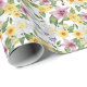 Papel de regalo floral morado amarillo blanco con hojas verdes. Ideal para cumpleaños, despedidas de soltera, graduaciones, bodas.