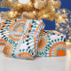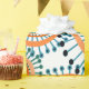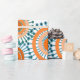 Este papel de envoltura tiene un diseño de anillos y círculos en tonos naranjas con líneas verde azuladas cruzando detrás de ellos formando flores en un campo de blanco.