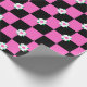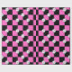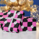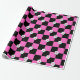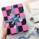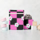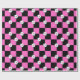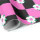 Un ilustracion sencillo y simétrico de flores en un tablero de ajedrez, de colores rosa y negro.