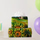 Paisaje toscano, colorido, vibrante, expresiva belleza de la flora italiana de verano y campos en naranja amarillo brillante, verde, marrón, colores azules, hermosas flores, cipreses y olivos, antigua granja rústica bajo el cielo azul. Pintura acrílica sobre lienzo.