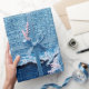 Fondo del denim texturado. Agujero roto en la tela. Tonos azules