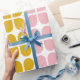 Este elegante papel de envoltura presenta un patrón retro de formas medias en una puesta de sol de colores cálidos que incluyen amarillo, coral y rojo. Gran idea de regalo.