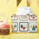 A playful grid of nine festive illustrations, each with vibrant Christmas ornaments or stylized tree shapes in triangular arrangements. Framed in bold holiday hues, this cheerful design brings a pop-art twist to seasonal decor and gifting.