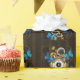 Composición de reloj de vapor redondo con dial numérico romano negro, decorado con arcos de oro y latón, mariposas morfo azules y lentes dañadas sobre fondo rayado marrón. Estilo Steampunk.