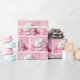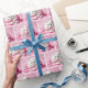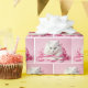 gato blanco bonito con ojos verdes enredado en cintas rosas sobre un fondo rosado y un borde blanco.