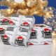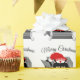 Un gato con aspecto de extraño que se ha subido a una caja de regalo de Navidad. El gato lleva un sombrero rojo de Santa. El lema dice sorpresa. El lema dice Feliz Navidad. La foto es en blanco y negro excepto por el sombrero de Santa Gata roja.