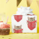 Gato de tabby con gafas leyendo el libro de la receta de ratones rojos sobre fondo blanco