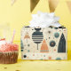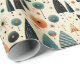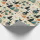 Papel de regalo divertido con un diseño moderno de mediados de siglo con gatos negros extraños, árboles abstractos y flores. Turquesa, naranja, blanco y negro.