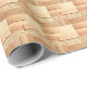 Geometric wooden panels are arranged against a textured sand backdrop, creating a visually interesting contrast between the smooth wood grain and the fine sand