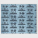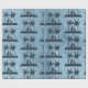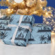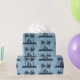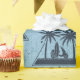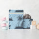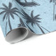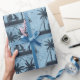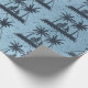 Diseño geométrico de temática playera moderna con siluetas de palmeras, tablas de surf y patines sobre fondo azul angustiado
