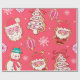 A sweet and festive artwork featuring charming gingerbread style Santa faces, cheerful snowmen, decorated Christmas tree cookies, peppermint candies, ornaments, and delicate snowflakes set against a bright pink background. The playful mix of holiday treats and whimsical details creates a warm, joyful, and delightfully cheerful Christmas vibe.