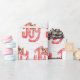 Un muñeco de nieve y un gingham JOY rojo y blanco en un divertido estilo tipo de letra en madera encalada con copos de nieve.