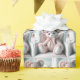 Un osito de peluche con un toque de gingham rosa y blanco se sienta en una silla blanca y elegante, adornada con un arco y flores en el oído