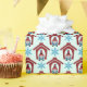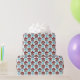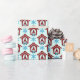 Este papel de envoltura está embellecido con un patrón gráfico de Navidades de gnomos repetidos parados en la puerta de una cabaña escandinava roja intercalada con copos de nieve azules. Se puede personalizar el color de fondo.