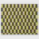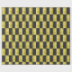 Abstract graphic, of geometric design, displays textured, gold panels, shaded with brown, yellow, and white-layered with panels of black, and digitally, arranged in a checkerboard pattern.