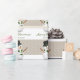El ilustracion personalizado de Destei de un lindo sonriente muñeco de nieve. El muñeco de nieve lleva un gorra negro y una bufanda con rayas verdes y blancas. El color de fondo es beige con un patrón de puntos blancos. Bajo la imagen se lee "¡Feliz Navidad!" en color verde. También hay un área de texto personalizable donde puede escribir, por ejemplo, a quién es el regalo o de quién es.