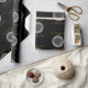 Papel de envolver para un regalo de graduación diseñado con un tapón negro de graduación con un círculo semitransparente detrás fijado sobre un fondo negro. Felicitaciones se graduaron en una fuente de estilo moderno en oro.