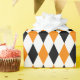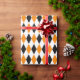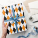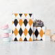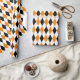 Papel de envoltura diseñado con un patrón de arlequín negro, naranja y blanco de gran tamaño. Personalizar el color de fondo blanco entre otras opciones.