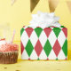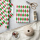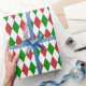 Papel de envoltura diseñado con un patrón de arlequín rojo oscuro, verde y blanco de gran tamaño. Personalizar el color de fondo blanco entre otras opciones.