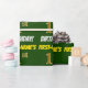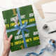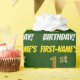 Este diseño de papel envolvente incluye un mensaje como "¡PRIMER CUMPLEAÑOS!", con el "primero" con un aspecto de color falso/imitación dorado, y con el nombre y el "CUMPLEAÑOS" en un tipo de letra divertido y audaz. El nombre se puede personalizar y el fondo es de color verde. El envolvimiento de papel como este podría ser usado cuando se le dan regalos de cumpleaños a alguien en celebración de su primer cumpleaños. [~Z0000208]