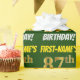 Este diseño de papel envolvente incluye un mensaje como "¡CUMPLEAÑOS 87 DE PRIMER NOMBRE!", en el que el "87" tiene un aspecto de color falso/imitación de color dorado, y con el nombre y el "CUMPLEAÑOS" en un tipo de letra divertido y audaz. El nombre se puede personalizar y el fondo es de color verde. El envolvimiento de papel como este podría ser usado cuando se le dan regalos de cumpleaños a alguien en celebración de sus ochenta y siete años. [~Z0000208]