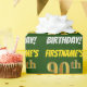 Este diseño de papel envolvente incluye un mensaje como "¡CUMPLEAÑOS 90 DE FIRSTNAME!", en el que el "90" tiene un aspecto de color falso/imitación de color dorado, y con el nombre y el "CUMPLEAÑOS" en un tipo de letra divertido y audaz. El nombre es personalizable y el fondo es verde. El envolvimiento de papel como este podría ser usado cuando se le dan regalos de cumpleaños a alguien en celebración de su cumpleaños número noventa. [~Z0000208]