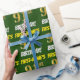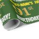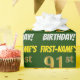 Este diseño de papel envolvente incluye un mensaje como "¡CUMPLEAÑOS 91 DE PRIMER NOMBRE!", mientras que el "91" tiene un aspecto de color falso/imitación de color dorado, y con el nombre y el "CUMPLEAÑOS" en un tipo de letra divertido y audaz. El nombre se puede personalizar y el fondo es de color verde. El envolvimiento de papel como este podría ser usado cuando se le dan regalos de cumpleaños a alguien en celebración de su cumpleaños noventa. [~Z0000208]