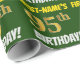 Este diseño de papel envolvente incluye un mensaje como "¡CUMPLEAÑOS 95 DE PRIMER NOMBRE!", en el que el "95" tiene un aspecto de color falso/imitación de color dorado, y con el nombre y el "CUMPLEAÑOS" en un tipo de letra divertido y audaz. El nombre se puede personalizar y el fondo es de color verde. El envolvimiento de papel como este podría ser usado cuando se le dan regalos de cumpleaños a alguien en celebración de sus noventa y cinco años. [~Z0000208]