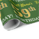Este diseño de papel envolvente incluye un mensaje como "¡59º CUMPLEAÑOS!", mientras que el "59º" tiene un aspecto de color falso/imitación de oro. El nombre se puede personalizar y el fondo es de color verde. Tal vez podría ser usado cuando se envuelven regalos para el cumpleaños cincuenta y nueve de alguien. [~Z0000179]
