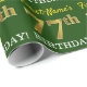 Este diseño de papel envolvente incluye un mensaje como "¡El CUMPLEAÑOS 77 del Nombre!", mientras que el "77" tiene un aspecto de color falso/imitación dorado. El nombre se puede personalizar y el fondo es de color verde. Tal vez podría usarse cuando se envuelven regalos para el cumpleaños setenta y siete de alguien. [~Z0000179]