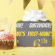 Este diseño de papel envolvente incluye un mensaje como "¡SÉPTIMO CUMPLEAÑOS DE NOMBRE PRIMERO!", en el que el "sexto" tiene un aspecto de color falso/imitación de color dorado, y con el nombre y el "CUMPLEAÑOS" en un tipo de letra divertido y audaz. El nombre es personalizable y el fondo es gris (gris). El envolvimiento de papel como este podría ser usado cuando se le dan regalos de cumpleaños a alguien en celebración de su sexto cumpleaños. [~Z0000211]