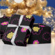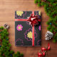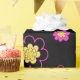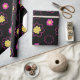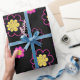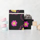 Patrón gráfico floral vintage, colores vibrantes en el fondo negro.