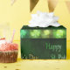 Un ilustracion del Día de San Patricio: 4 formas diferentes de shamrock y letras del "Feliz Día de San Patricio" en los colores de la bandera irlandesa sobre un fondo verde y gris.