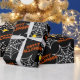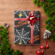 Este fresco papel de envoltura con telarañas y arañas en un fondo negro es perfecto para Halloween. Naranja Feliz texto de Halloween.